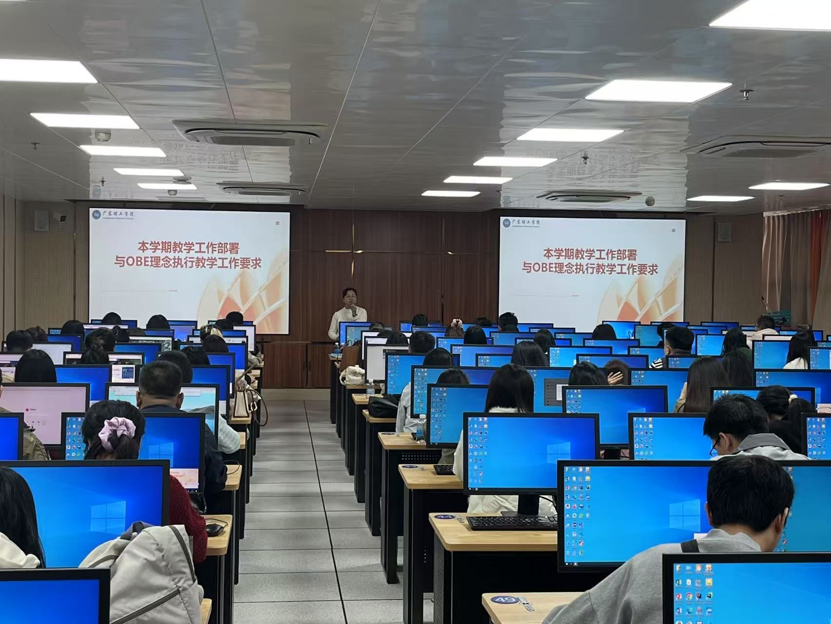 会议议程一,梁慧仪副院长就本学期教学工作进行部署,着重介绍OBE(Outcome-Based Education,成果导向教育)理念,要求各教学单位熟悉课程教学大纲,确保OBE理念落实到课堂教学中。梁院长以电子商务专业为例,与大家一起进行了深入的研讨和交流。