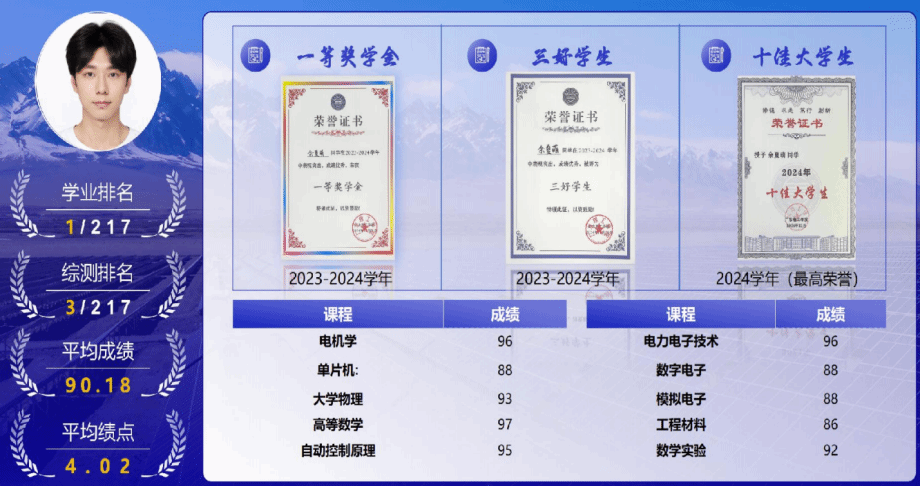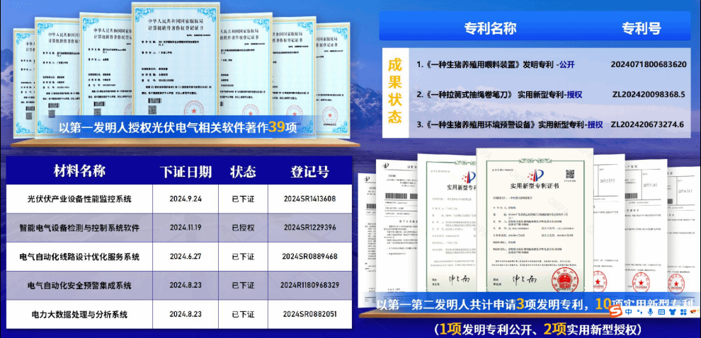 余夏萌同学曾获校级十佳大学生,校级三好学生,校级一等奖学金。实习期间,他作为优秀实习生代表公司参加光伏行业峰会,并获得行业推荐信。在学科竞赛方面,他积极发挥带头作用,担任学校学科竞赛负责人,带领众多学生参与其中,还受邀开展多次宣讲会。在创新成果上,成绩突出,拥有39项软件著作权、以第一第二作者申请3项发明专利和10项实用专利,以第一作者发表4篇国家级学术期刊和1篇EI工程检索论文。在项目实践中,以项目负责人主持1项国家级大学生创新训练项目和1项省部级立项。在竞赛中,曾获第十八届ICAN创新创业大赛华南赛区一等奖,2024年中国国际大学生创新大赛广东分赛铜奖。此次在职业规划大赛中获奖,更是他综合能力的有力证明。