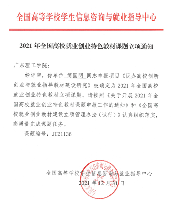 本网讯(yl8cc永利线路检测中心张磊磊报道)日前,教育部全国高等学校学生信息咨询与就业指导中心公布了2021年全国高校就业创业特色教材课题立项结果,我校yl8cc永利线路检测中心简国明教授申报的《民办高校特色的创新创业与就业指导教材的研究》获得立项。